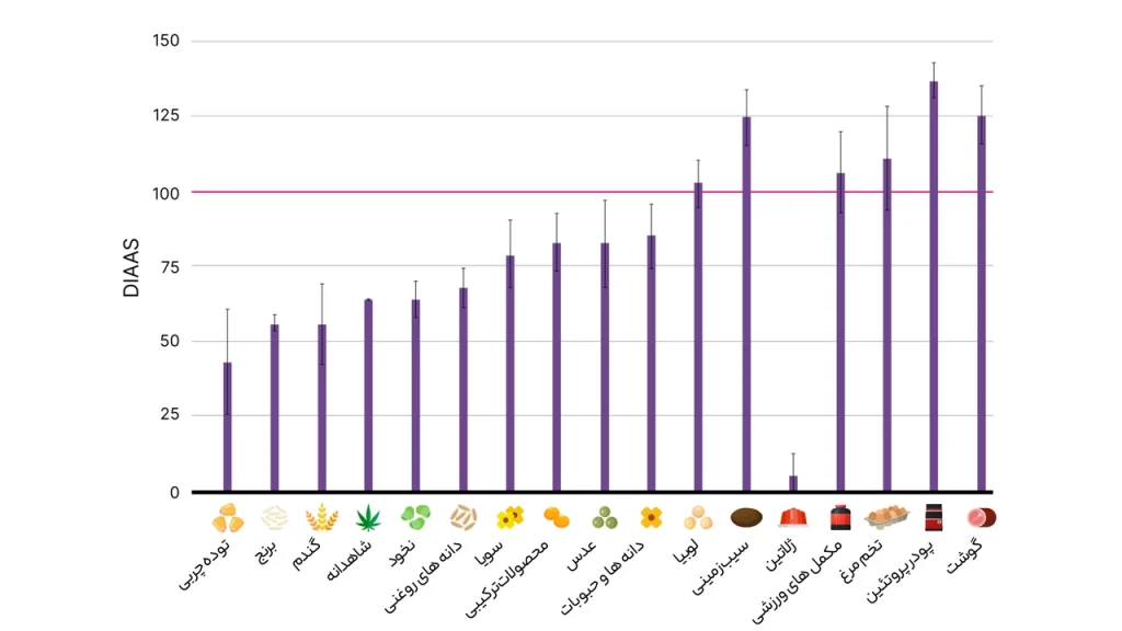 DIAAS ممکن است کمتر یا بیشتر از ۱۰۰% باشد، که ۱۰۰% نشاندهنده این است که پروتئین موجود در غذا تمام آمینواسیدهای ضروری را در مقادیر کافی فراهم میکند. این بدان معنی است که اگر غذا به میزان نیاز متوسط (EAR) برای پروتئین مصرف شود، نیاز به آمینواسیدها برطرف خواهد شد.